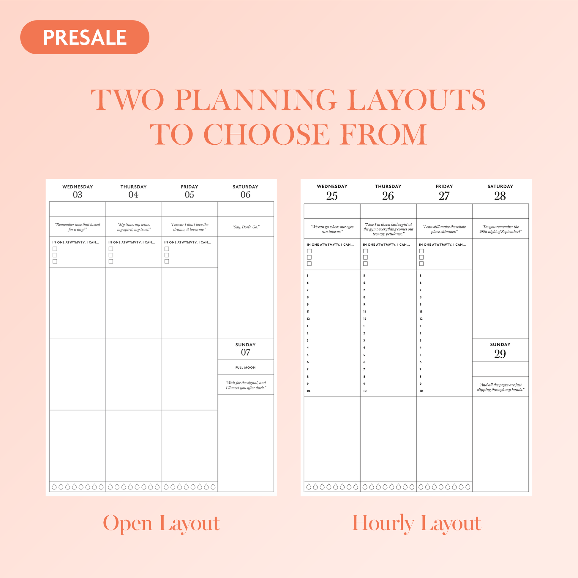 Our planner will help you set up your dominoes at the beginning of the year and knock them out each month. Start each day with the perfect Taylor lyric and knock out your tasks one ATWTMVTV at a time.
