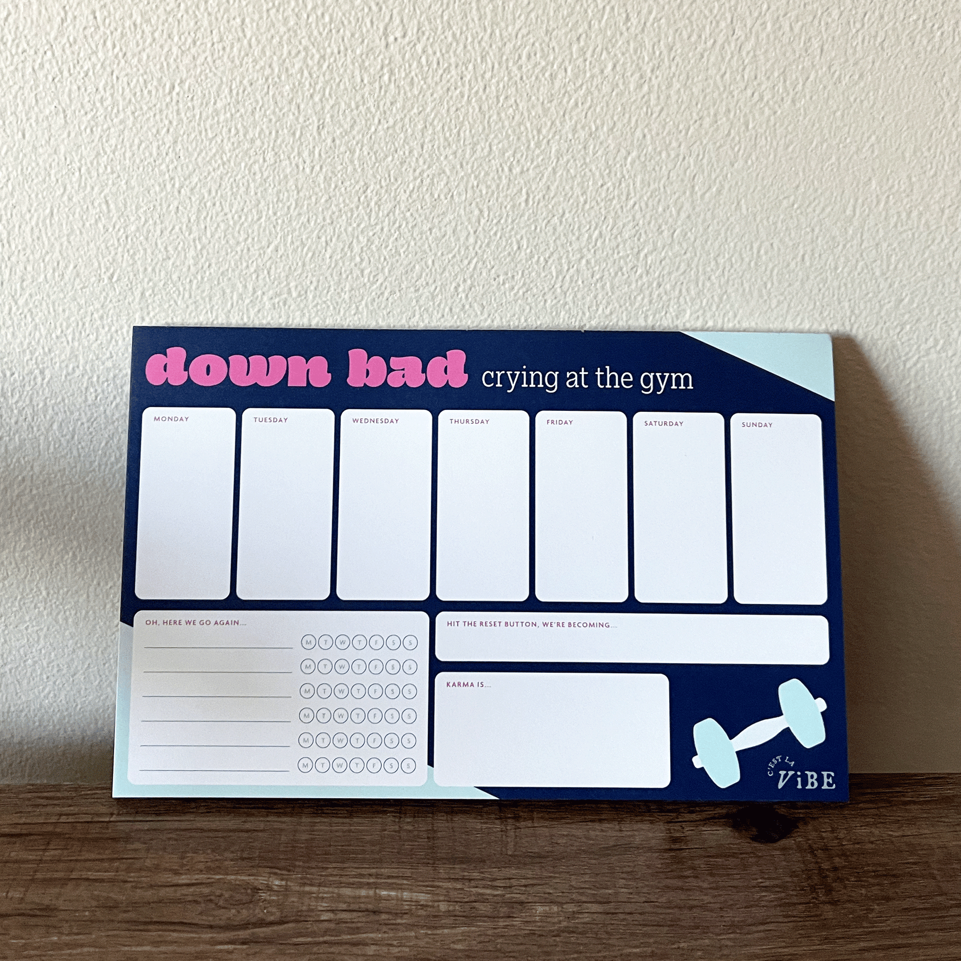 Your new favorite fitness tracker has arrived! This is an undated pad with 50 tearaway sheets featuring our custom design that will motivate you to not stay Down Bad in the gym.